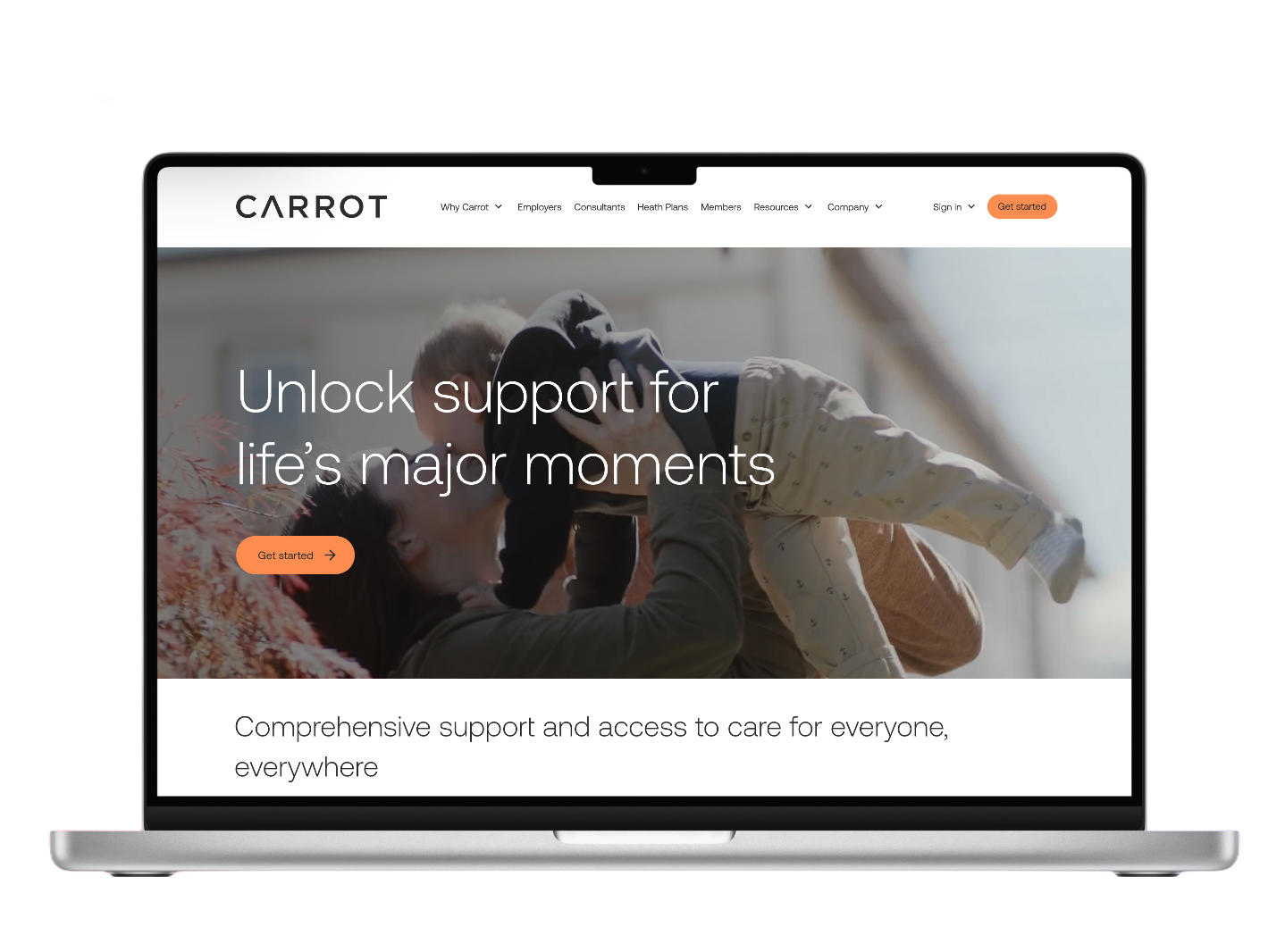We inherited a recently refreshed identity from an agency partner that was strong on clinical credibility but lacking warmth. By centering real Carrot members and their stories, we transformed a dark, minimal system into one that felt emotionally resonant across employers, health plans, consultants, and members.